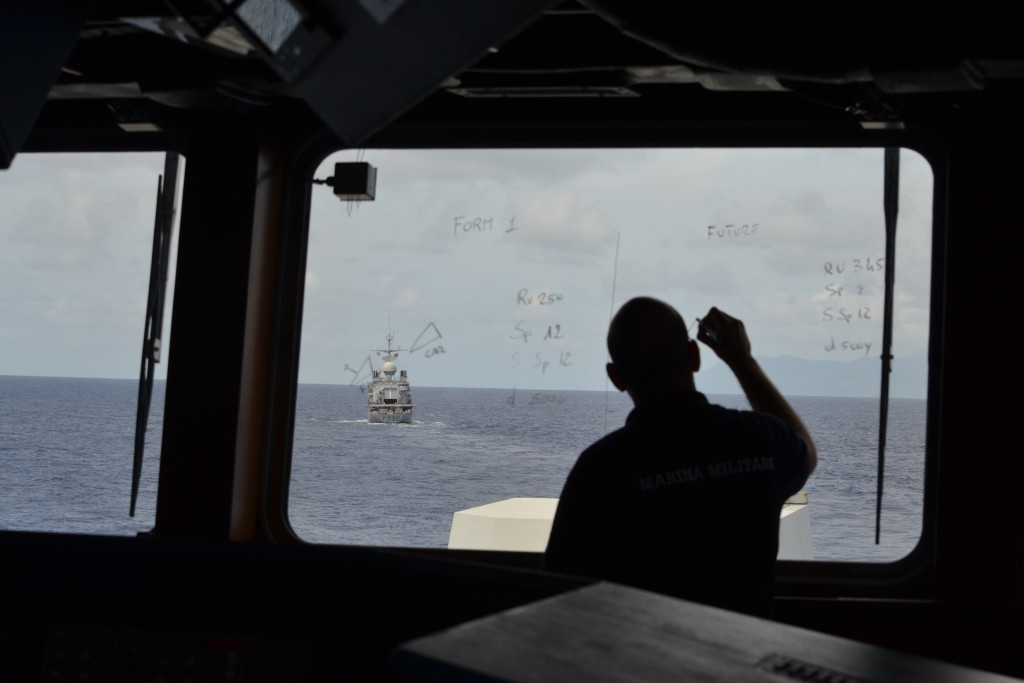 The exercise was coordinated by the ships’ commanding officers, Commander François Xavier Waroux and Commander Francesco Saladino. The training really tested the ships’ crews and included close-proximity manoeuvres, visual communications, flight operations and helicopter landings.